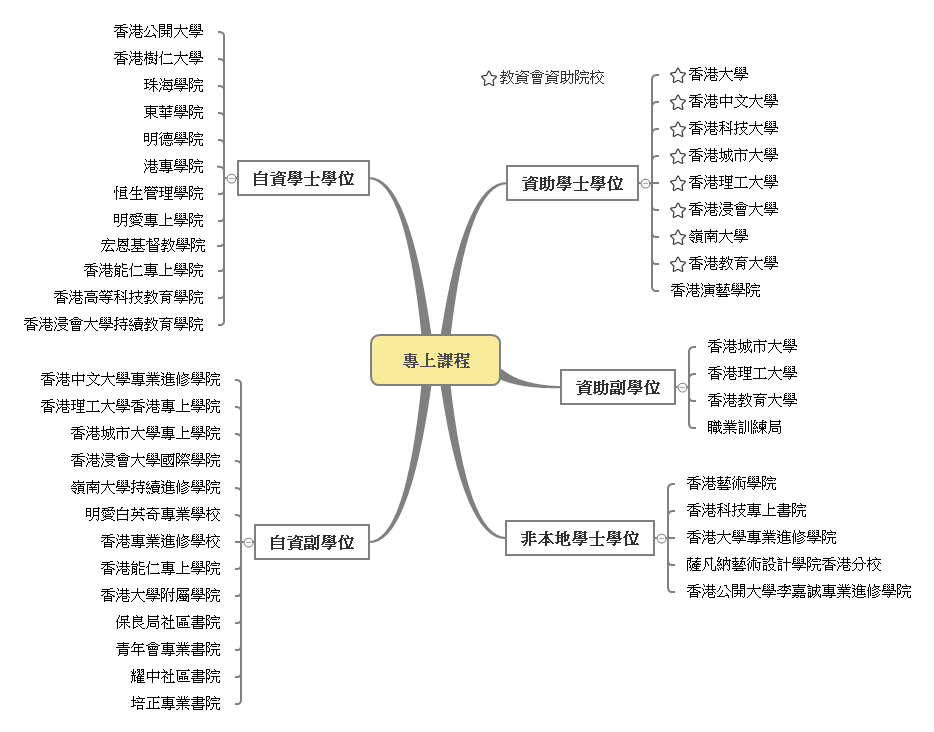 大專課程有五大種類,分別是:政府資助學士學位課程(主要由八所資助大學開辦)、自資學士學位課程(主要由公大、仁大、及認可專上學院開辦)、政府資助副學位課程(主要由理大、教大及職業訓練局開辦)、自資副學位課程及非本地學士學位課程(由其他專上院校開辦)。點擊顯示說明圖。