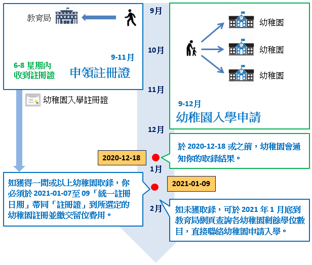 - 於 2020 年 9 月至 11 月期間填妥及遞交「幼稚園入學註冊證」申請(點擊顯示申請表格樣本),你將會於 6-8 星期內以郵遞方式收到「註冊證」(點擊顯示樣本)。