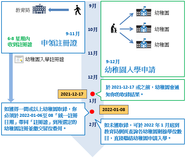 - 於 2021 年 9 月至 11 月期間填妥及遞交「幼稚園入學註冊證」申請(點擊顯示申請表格樣本),你將會於 6-8 星期內以郵遞方式收到「註冊證」(點擊顯示樣本)。