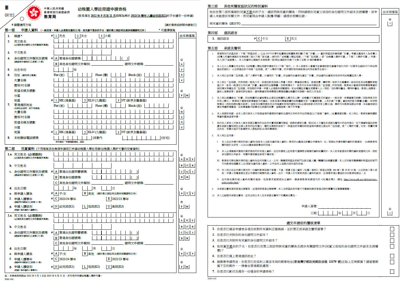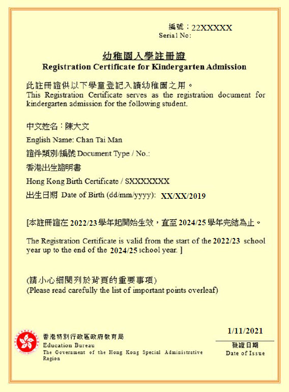 - 於 2022 年 9 月至 11 月期間填妥及遞交「幼稚園入學註冊證」申請(點擊顯示申請表格樣本),你將會於 6-8 星期內以郵遞方式收到「註冊證」(點擊顯示樣本)。