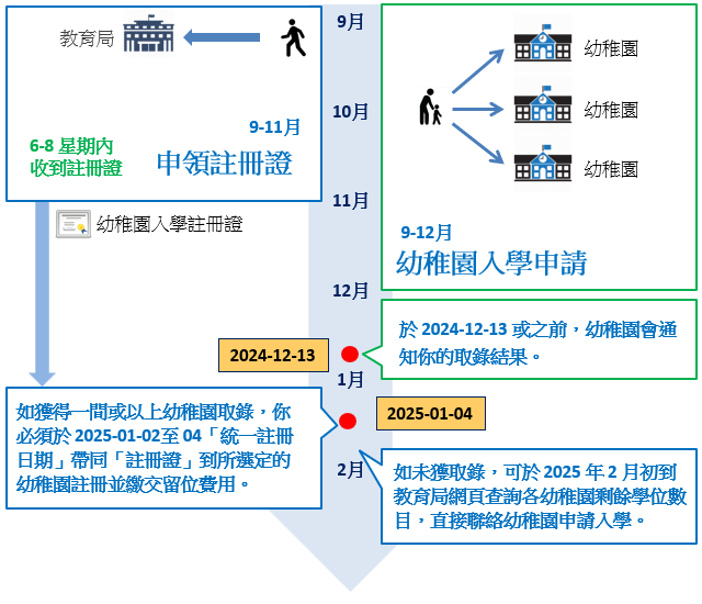 - 於 2024 年 9 月至 11 月期間填妥及遞交「幼稚園入學註冊證」申請(點擊顯示申請表格樣本),你將會於 6-8 星期內以郵遞方式收到「註冊證」(點擊顯示樣本)。