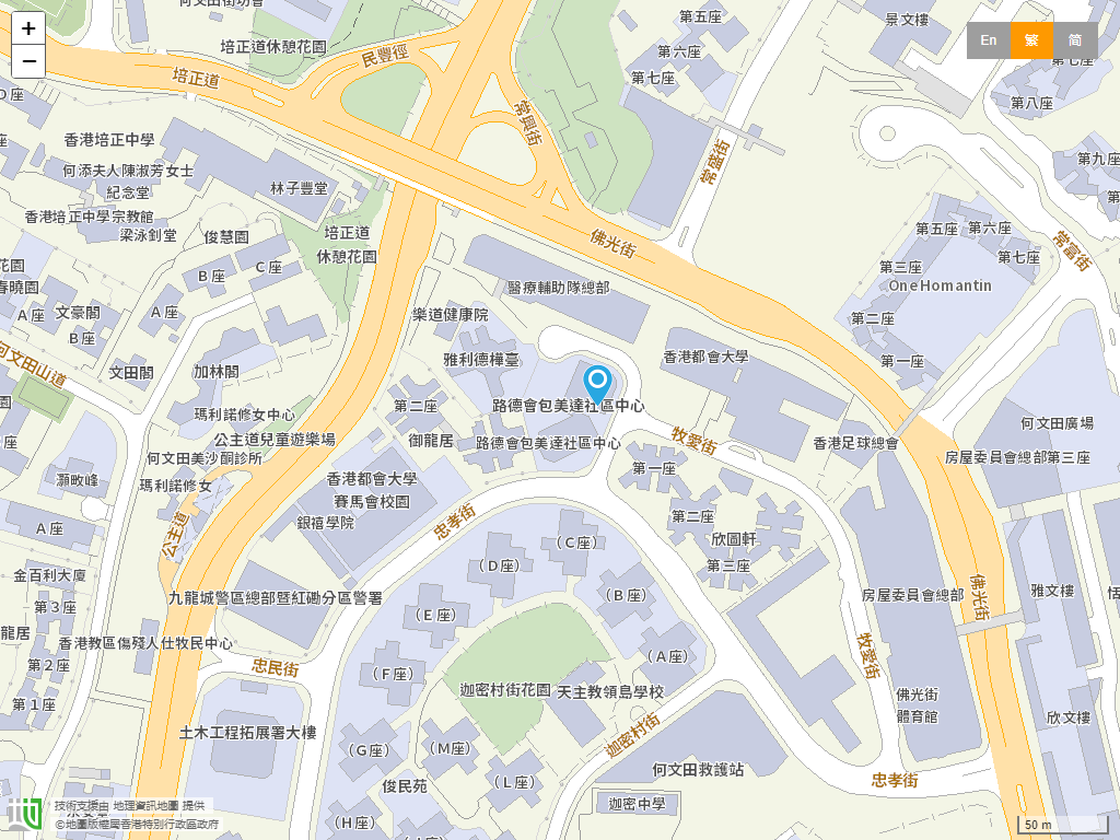 學校位置:九龍城區 › 九龍何文田忠孝街89號包美達社區中心4樓。學校地圖。