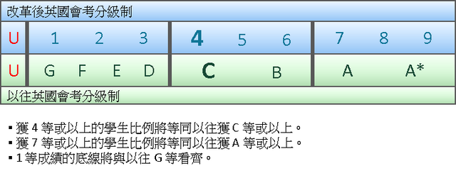 在新制中,獲 4 等或以上成績的學生比例將等同於舊制中獲 C 等或以上。所以,新制將合格的成績比舊制劃分得更仔細,由以往的 4 個等級 (C, B, A, A*) 增至 6 個等級 (4, 5, 6, 7, 8, 9)。即是說,新制的 4 等與舊制的 C 等並不完全相同,因為以往的 C 等包含了新制的 4 等和部分 5 等的成績,所以在新制中取得 4 等的話,只是以往 C 等中較低的成績。這意味着新的計分制提高了考試的競爭性,更能分出高下。