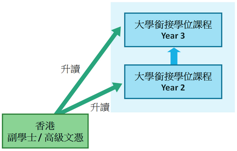 香港的副學士和高級文憑的畢業生可銜接到本地大學學位課程,但由於本地的大學學額供應緊張,畢業生要取得一席位並非容易。而英國的大學學額較香港充裕,銜接英國的學位課程成為副學士和高級文憑畢業生的另一大學之路。