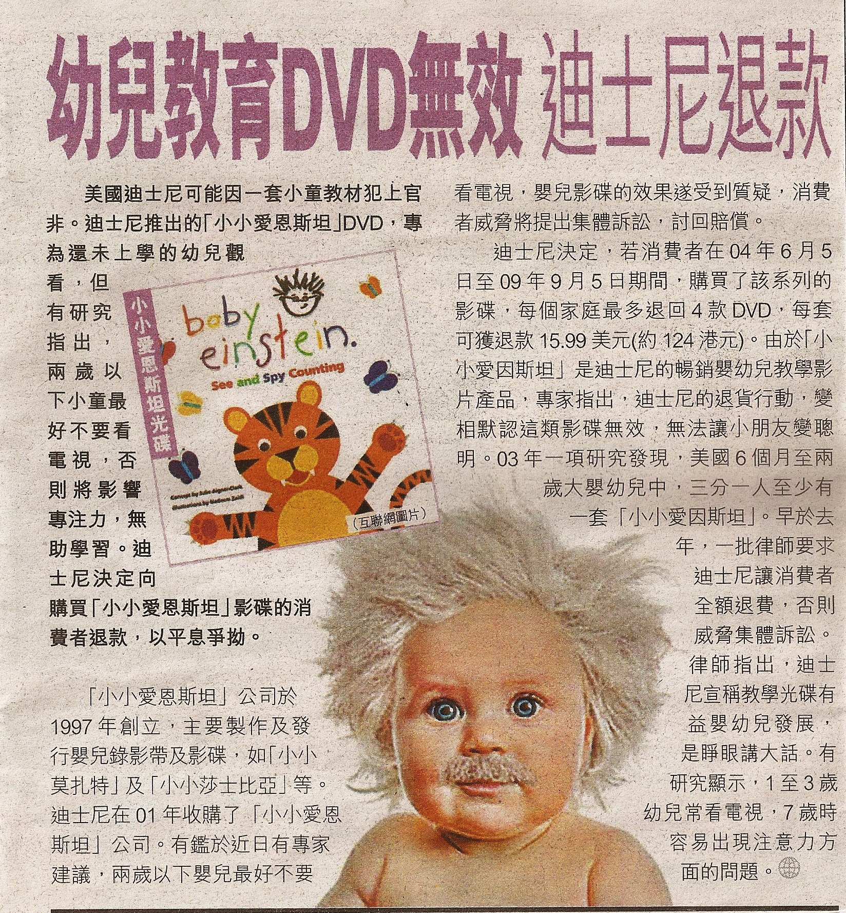 《都市日報》2009 年 10 月 27 日的報導指出:「美國迪士尼可能因一套小童教材犯上官非。迪士尼推出的『小小愛恩斯坦』DVD,專為還未上學的幼兒觀看,但有研究指出,兩歲以下小童最好不要看電視,否則將影響專注力,無助學習。迪士尼決定向購買『小小愛恩斯坦』影碟的消費者退款,以平息爭拗。