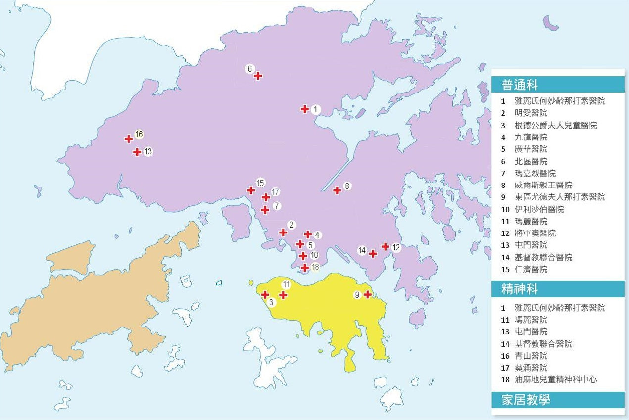 - 雅麗氏何妙齡那打素醫院 青山醫院 葵涌醫院 瑪麗醫院 贊育醫院 屯門醫院 基督教聯合醫院 油麻地兒童及青少年精神健康服務 東區尤德夫人那打素醫院